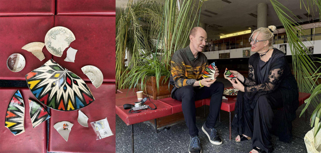 (Left) Fragments of tableware destroyed by the explosion (Right) Photographer and multimedia artist Vera Blansh, who cooperated in the “fragment exchange”