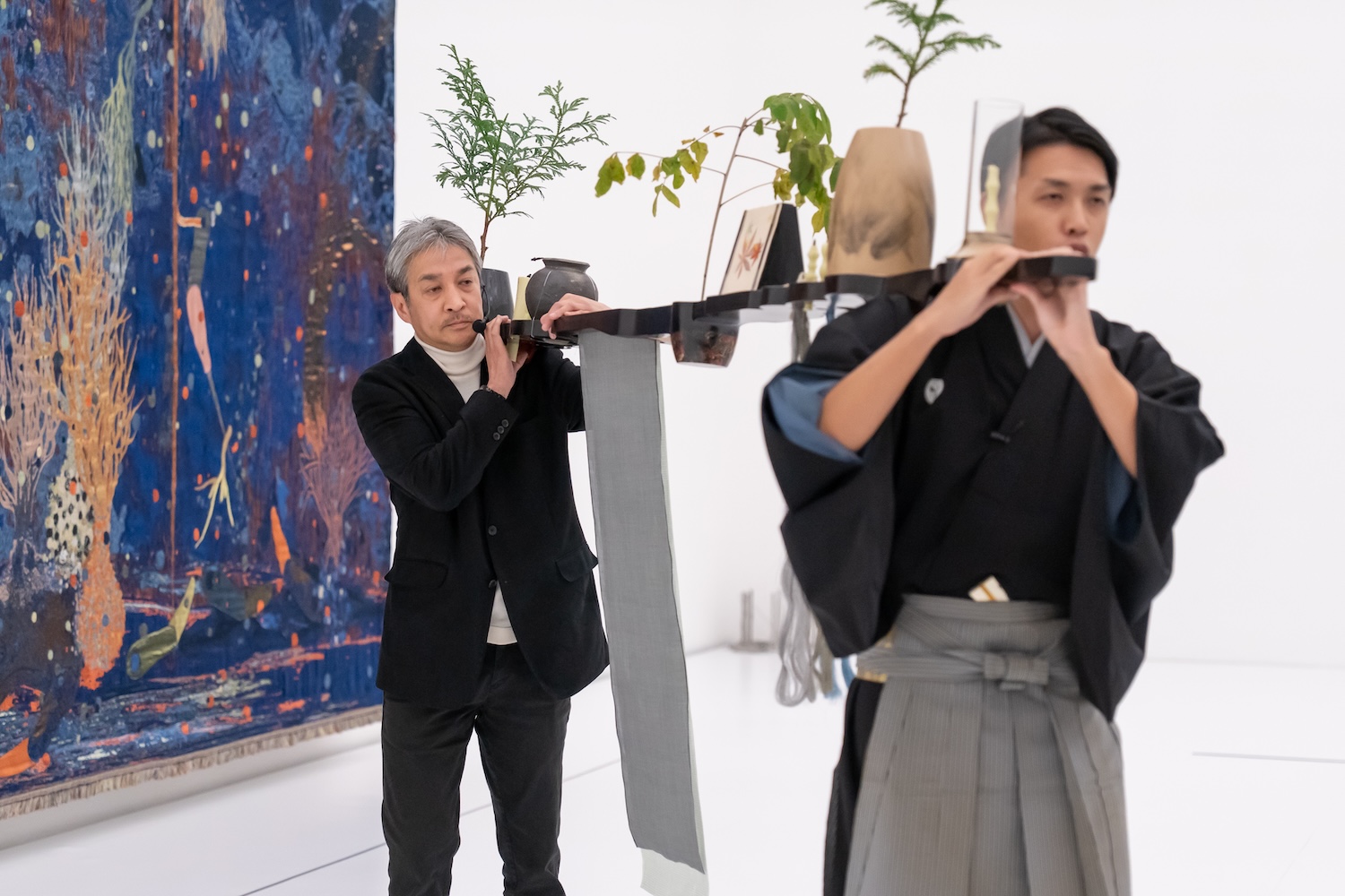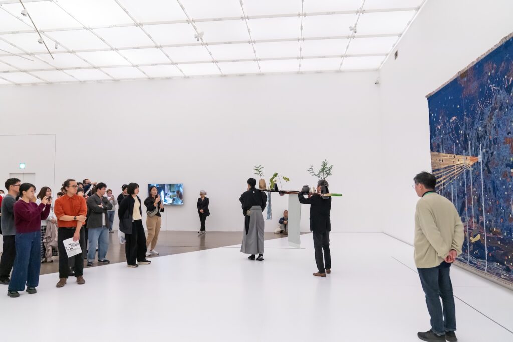 輪島塗の技法を使い、慶塚が作り手の一人として参加したオトボン・ンカンガの新作《シェイプド・バイ・メニー》を能楽狂言師・炭光太郎氏とともに担ぎ、作品に込めた思いをしたためた手紙を読み上げながら、展示会場内をねり歩きました。