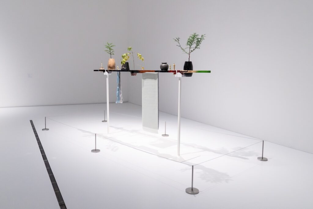 《シェイプド・バイ・メニー》は、昨年夏に作家が石川県に滞在し、県内の多様な素材や工芸技術をリサーチした成果として制作されたもの。オトボン・ンカンガによるデザインをもとに、輪島塗のほか、山中漆器や珠洲焼、能登上布など、県内のさまざまな伝統技術と素材を融合させた杖(スティック)状の作品です。